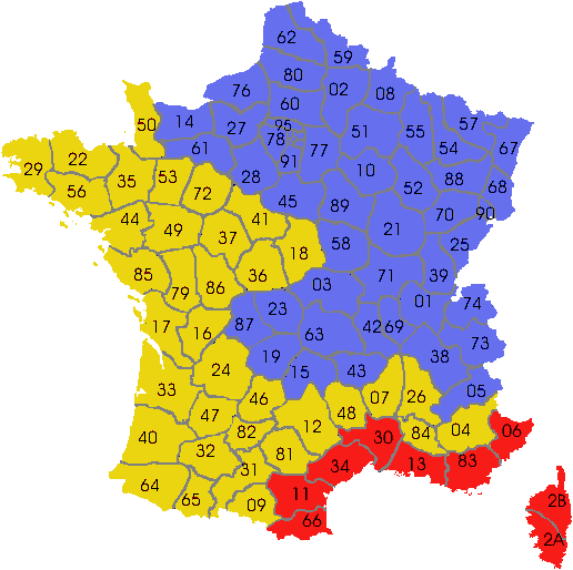 Calculez et comparez votre prime énergie Carte des zones thermiques : départements en bleu = zone H1 départements en jauen = zone H2 départements en rouge = zone H3